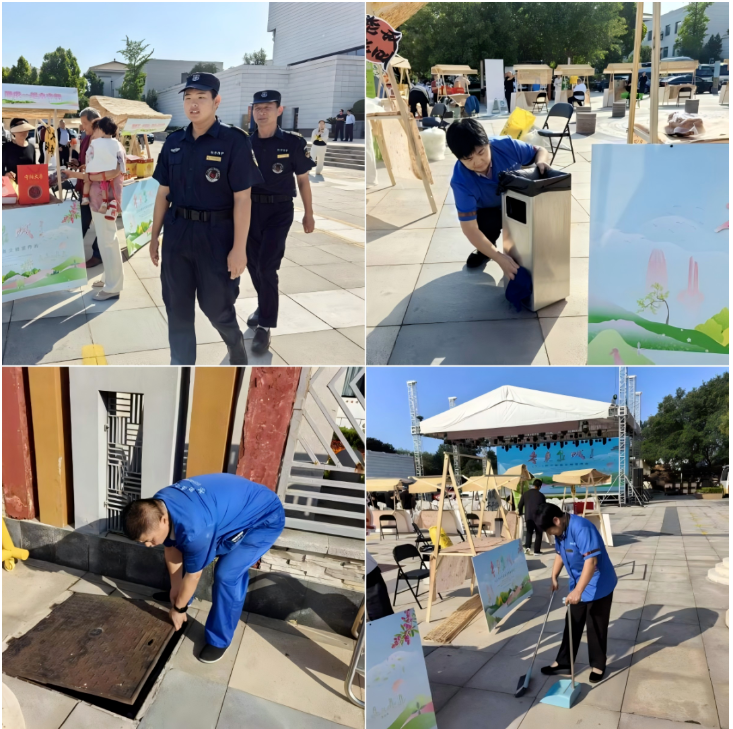 市集服務(wù)見(jiàn)真章,煙火氣里守規(guī)范。室外非遺市集熱鬧非凡,寧陽(yáng)大棗制品、傳統(tǒng)糕點(diǎn)等特色美食香氣四溢。項(xiàng)目提前規(guī)劃攤位動(dòng)線,增設(shè)垃圾桶10余組,保潔團(tuán)隊(duì)采用“即時(shí)清掃 + 定點(diǎn)值守”模式,確保油污雜物隨產(chǎn)隨清。工程人員定時(shí)巡查攤位用電用水安全,為商戶(hù)提供臨時(shí)儲(chǔ)物、應(yīng)急供水供電等服務(wù)。秩序維護(hù)團(tuán)隊(duì)針對(duì)高峰時(shí)段,快速啟動(dòng)單向通行疏導(dǎo)方案,保證市民朋友有序、舒適的逛集體驗(yàn)。